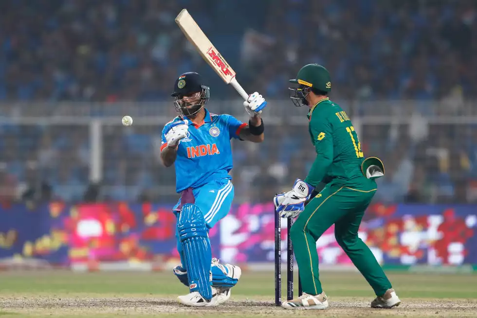 ভারতের রেকর্ড গড়া ইনিংসে ব্যাট হাতে সর্বোচ্চ ৭৬ রান করেন বিরাট কোহলি। এদিন ব্যাট হাতে ভারতের শুরুটা হয়েছিল ঝোড়ে। মার্কো ইয়ানসেনের প্রথম ওভারে কোহলি ও রোহিত মিলে তোলেন ১৫ রান। দ্বিতীয় ওভারেও কেশভ মহারাজের প্রথম দুই বলে চার মারেন রোহিত। তবে, তৃতীয় বলেই স্কয়ার লেগে হেনরিখ ক্লাসেনের হাতে ধরা পড়েন তিনি। আউটের আগে করেন ৫ বলে ৯ রান। এর পর একে তিন টপ অর্ডারকে হারায় ভারত। তবে স্রোতের বিপরীতে থেকে ইনিংস বড় করেন কোহলি। তার ব্যাটে চড়েই বড় পুঁজি পায় ভারত।