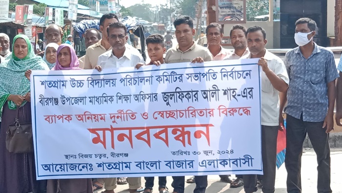 বীরগঞ্জ পৌরশরের বিজয় চত্বরে ৩০ জুন রবিবার বেলা ৪ টায় শতগ্রাম ইউনিয়নবাসীর ব্যানারে আধা ঘণ্টাব্যাপী এই মানববন্ধন করে। মানববন্ধনে শতগ্রাম উচ্চ বিদ্যালয় অভিভাবক সদস্য মো: সফিকুল ইসলাম বাবুল, মো: বদিউল ইসলাম, হামিদা খাতুন মুন্নি, রেবা আক্তার, ফারুক ইসলাম সহ অনেকে অংশ নেন।