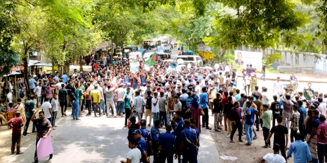 শনিবার (৬ জুলাই) বেলা সাড়ে ১১টার দিকে বিশ্ববিদ্যালয়ের প্রধান ফটকের সামনে ঢাকা-পাবনা মহাসড়ক অবরোধ করে বিক্ষোভ শুরু করেন তারা। প্রায় এক ঘণ্টা চলে এই অবরোধ। এতে মহাসড়কের দুইপাশে যান চলাচল বন্ধ হয়ে যায়। পরে প্রশাসনের অনুরোধে ক্যাম্পাসে ফিরে যান শিক্ষার্থীরা।
