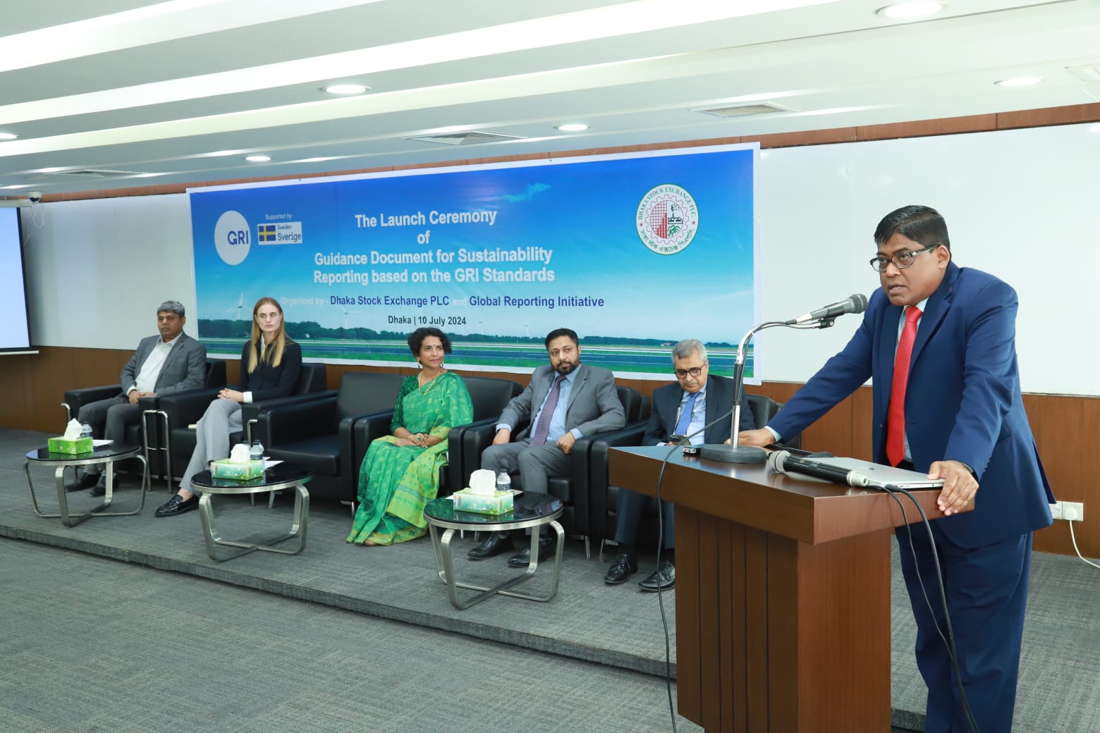 আজ ১০ জুলাই ২০২৪ তারিখে নেদারল্যান্ড ভিত্তিক গ্লোবাল রিপোর্টিং ইনিশিয়েটিভ (জিআরআই) ও ঢাকা স্টক এক্সচেঞ্জ যৌথ উদ্যোগে তালিকাভুক্ত ৭৫টি কোম্পানির প্রতিনিধিবৃন্দের অংশগ্রহণে ডিএসই’র ট্রেনিং একাডেমি-তে Launch Ceremony of Guidance Document for Sustainability Reporting on the GRI Standards-2021 শীর্ষক অনুষ্ঠানে ডিএসই’র চেয়ারম্যান অধ্যাপক ড. হাফিজ মুহম্মদ হাসান বাবু এসব কথা বলেন৷ এসময় উপস্থিত ছিলেন ডিএসইর ব্যবস্থাপনা পরিচালক (ভারপ্রাপ্ত) সাওিক আহমেদ শাহ, ঢাকা সুইডেন দূতাবাস-এর সেকেন্ড সেক্রেটারি ফ্রেডরিকা নরেন (Fredrika Noren) ডিএসই’র প্রধান রেগুলেটরী কমকতা খাইরুল বাসার আবু তাহের, মহাব্যবস্থাপক মোঃ ছামিউল ইসলাম, জিআরআই সাউথ এশিয়া নেটওয়ার্কের পরিচালক ড. অদিতি হালদার (Dr.Aditi Haldar), ম্যানেজার রাহুল সিং (Rahul Singh), আইওটিএ (IOTA) কনসালটিং বাংলাদেশ এর প্রতিষ্ঠাতা এবং সিইও মোহাম্মদ গোলাম কিবরিয়া এবং সাসটেনেবিলিটি নেক্সাস লি. এর পরিচালক মুনতাসির নাহিদ৷