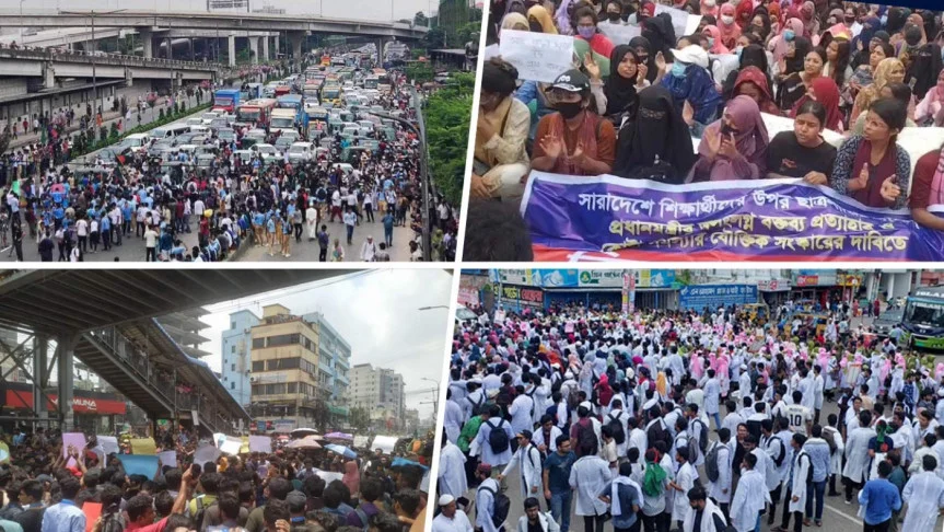 টা পদ্ধতি সংস্কারের দাবিতে বিভিন্ন কলেজ ও বিশ্ববিদ্যালয়ের শিক্ষার্থীরা রাজধানীর বিভিন্ন এলাকার সড়ক অবরোধ করে আন্দোলন করছেন। ফলে, রাজধানীর অধিকাংশ এলাকায় যান চলাচল স্থবির হয়ে পড়েছে। এতে ভোগান্তিতে পড়েছেন সাধারণ পথচারীরা। তাই সড়কে অতিরিক্ত পুলিশ মোতায়েন করা হয়েছে।