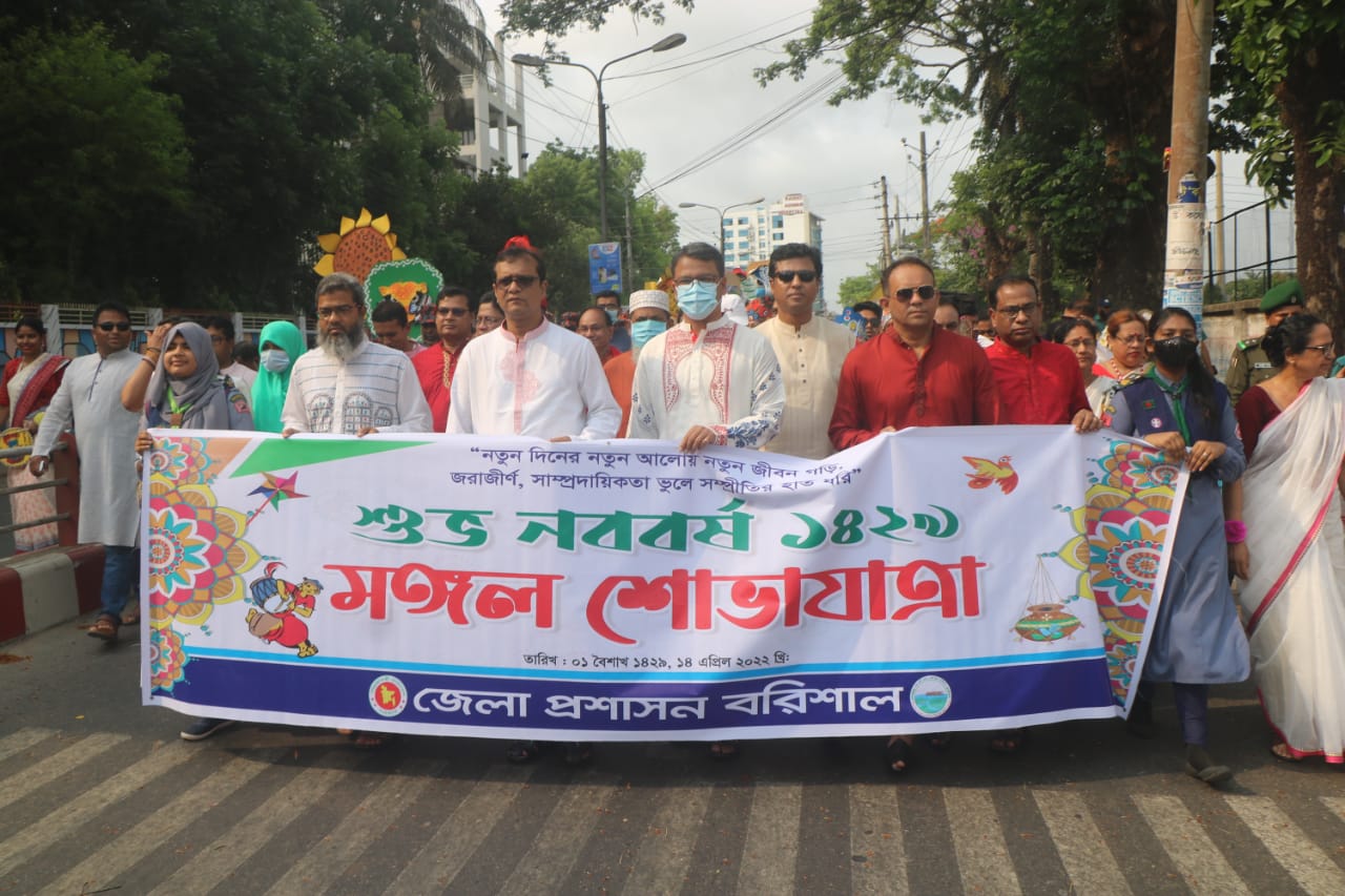 তুহিন,বরিশাল প্রতিনিধি : চারুকলা বরিশাল, উদীচী শিল্পগোষ্ঠি ও বরিশাল নাটক সহ বরিশাল জেলা প্রশাসন তিনভাগে বিভক্ত হয়ে নতুন বছরের বর্ষবরণ-১৪২৯ সংক্ষিপ্তভাবে বিভিন্ন অনুষ্ঠানের মাধ্যমে আয়োজন ও অনুষ্ঠিত হয়েছে। বিশ্বব্যাপি বৈশ্বক মহামারি করোনার আতঙ্কের দিনগুলি পাড় করে ২ বছর পর বরিশাল চারুকলার নির্মল করো মঙ্গল করে মলিন মর্ম মুছায়ে মঙ্গল শোভাযাত্রা।