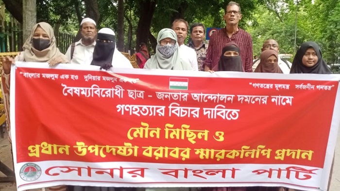 সোনার বাংলা পার্টি স্মারকলিপিতে উল্লেখ করেন, বিগত হাসিনা সরকারের ১৫ বছরের সকল হত্যাকান্ডের বিচার করতে হবে। সকল অবৈধ সম্পত্তি বাজেয়াপ্ত করে রাষ্ট্রের কোষাগারে রাখতে হবে শুধু তাই নয় খুনি হাসিনা সরকারের মন্ত্রী পরিষদ, সংসদ সদস্য ও হাসিনার দলের লুটপাটকারীদের বিচার ও সম্পদ বাজেয়াপ্ত করতে হবে।