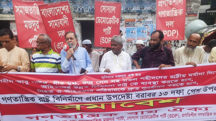 নিজস্ব প্রতিবেদকঃ গণতান্ত্রিক বাম ঐক্যের উদ্যোগে ২০ আগস্ট ২০২৪ মঙ্গলবার সকাল ১০:৩০ মিনিটে জাতীয় প্রেসক্লাবের সামনে শহীদ আবু সাঈদ, মীর মুগ্ধ, রুদ্র সেন সহ সকল শহীদদের রাষ্ট্রীয় মর্যাদা প্রদান, আহতদের উন্নত চিকিৎসার ব্যবস্থা করা, নিহত ও আহতদের পরিবারকে দ্রুত পুনর্বাসনের দাবিতে সমাবেশ অনুষ্ঠিত হয়। সমাবেশে শেষে গণতান্ত্রিক রাষ্ট্র বিনির্মাণে প্রধান উপদেষ্টা বরাবর ১৩ দফা পেশ করা হয়।