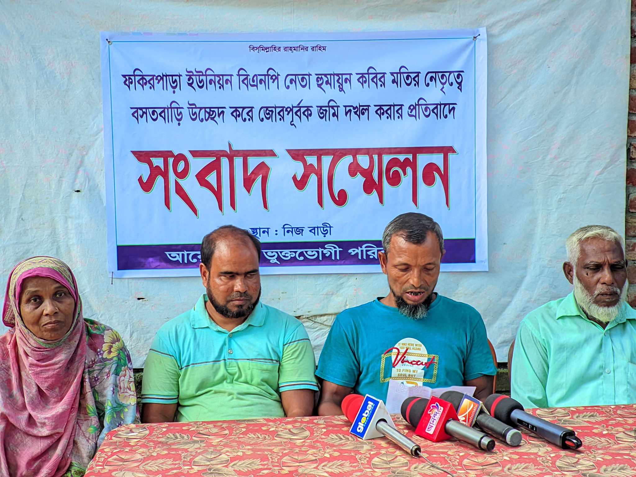 বুধবার দুপরে উপজেলার ফকির পাড়া ইউনিয়নের তিন নং ওয়ার্ডে এ সংবাদ সম্মেলন অনুষ্ঠিত হয়। মন্টু মিয়া সংবাদ সম্মেলনে লিখিত বক্তব্য অভিযোগ করে বলেন শেখ হাসিনা সরকারের পতনের পর ওই ইউনিয়ন বিএনপির সদস্য সচিব হুমায়ুন কবির মতির নেতৃত্বে কয়েকজন সশস্ত্র সন্ত্রাসী বাহিনী এসে আমার বসত বাড়ি ভাংচুর ও লুটপাট করে নিয়ে যায়। পরে ওই জমি দখল করে অবৈধ ভাবে বাউন্ডারি লাগানোর ব্যাবস্থা করেন।