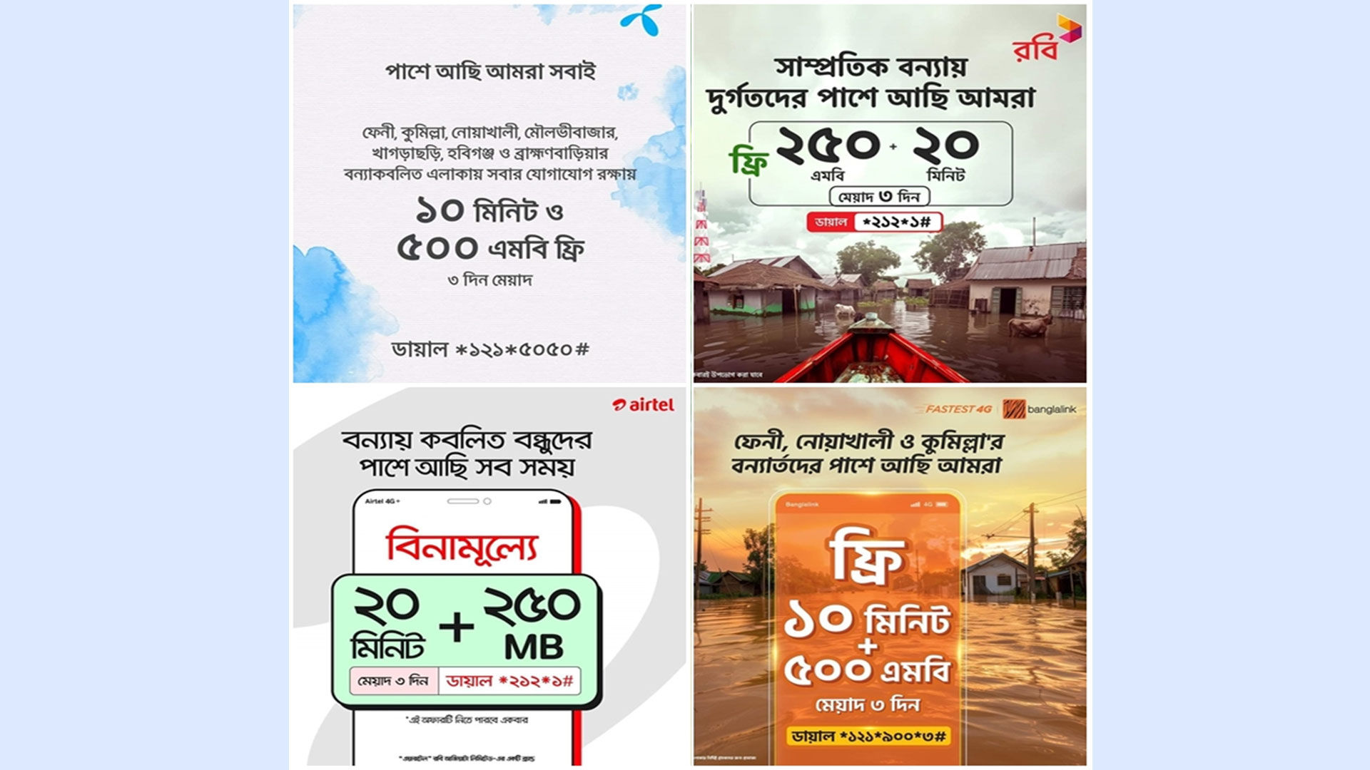 ভারী বৃষ্টি ও ভারতের উজানের পানিতে স্মরণকালের ভয়াবহ বন্যার কবলে ফেনী, নোয়াখালীসহ কয়েকটি জেলা। এসব এলাকার বন্যাকবলিত মানুষের জন্য ফ্রি টকটাইম এবং ইন্টারনেট সুবিধার ঘোষণা দিয়েছে দেশের ৪টি অপারেটর।