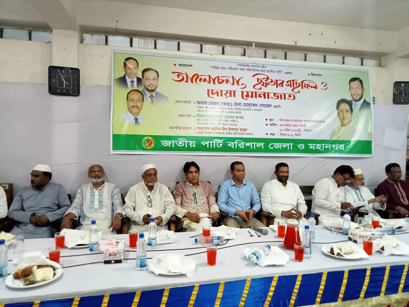 কেন্দ্রীয় উপদেষ্টা ও বরিশাল মহানগর জাতীয় পার্টির আহ্বায়ক অধ্যাপক মহসিন-উল-ইসলাম হাবুল’র সভাপতিত্বে অনুষ্ঠিত ইফতার মাহফিলে প্রধান বক্তা ছিলেন জাতীয় পার্টির কেন্দ্রীয় যুগ্ম মহাসচিব ও বরিশাল মহানগর জাতীয় পার্টির সদস্য সচিব ইঞ্জিনিয়ার ইকবাল হোসেন তাপস।