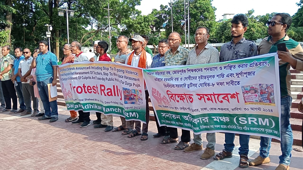 নিজস্ব প্রতিবেদকঃ অদ্য ৩০ আগস্ট, রোজ- শুক্রবার, বিকাল ৩:৩০ মিনিটে কেন্দ্রীয় শহীদ মিনারে চলমান সহিংসতা বন্ধ, জোরপূর্বক শিক্ষকদের পদত্যাগ ও লাঞ্ছিত করার প্রতিবাদে, কর্মস্থানে হয়রানি বন্ধ ও দোষীদের দৃষ্টান্তমূলক শাস্তি এবং দুর্গাপূজার তিনদিনের সরকারি ছুটিসহ ঘোষিত ৮ দফা দাবীতে সনাতন অধিকার মঞ্চ (এসআরএম)-এর উপদেষ্টা অধ্যাপক অশোক তরু মহোদয়ের সভাপতিত্বে বিক্ষোভ সমাবেশ অনুষ্ঠিত হয়।