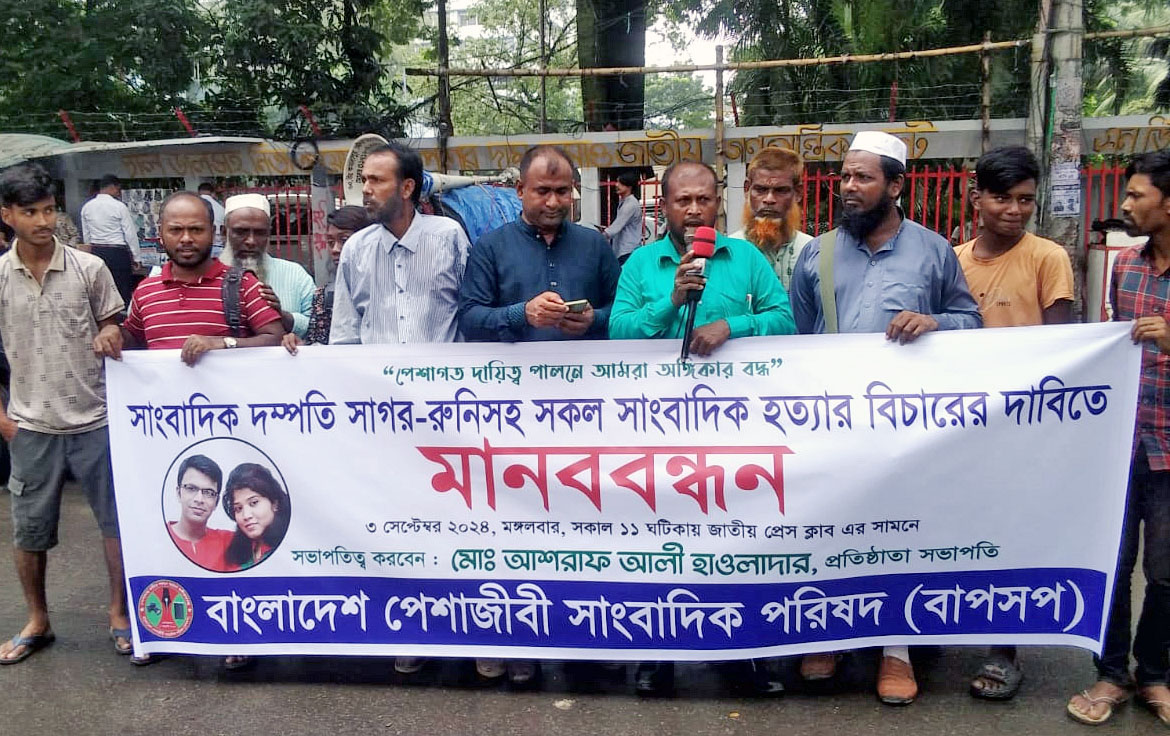 সভাপতির বক্তব্যে তিনি বলেন, সাংবাদিক দম্পত্তি সাগর-রুনি সহ সকল সাংবাদিকদের হত্যার বিচার অতি দ্রুত করতে হবে। বিগত সরকার সাগর-রুনি হত্যাকান্ডের বিচার না করার জন্য বিভিন্ন অযুহাত দিয়ে বার বার প্রতিবেদন পিছিয়ে দিয়েছে। অন্তর্বর্তীকালীন সরকারের মাননীয় প্রধান উপদেষ্টার কাছে আমাদের দাবি অতিদ্রুত সাগর-রুনি সহ সকল সাংবাদিক হত্যাকারীদের গ্রেফতার করে দৃষ্টান্তমূলক শাস্তির দাবি করছি।