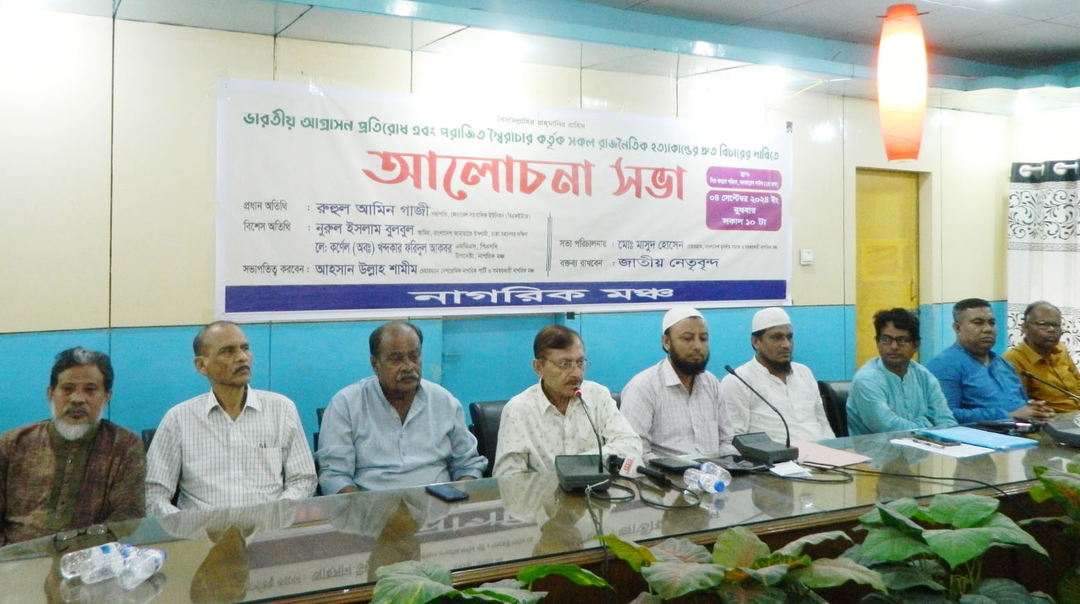 সভাপতির বক্তব্যে নাগরিক মঞ্চের সমন্বয়কারী ও দেশপ্রেমিক নাগরিক পার্টির চেয়ারম্যান আহসান উল্লাহ শামীম বলেন, স্বাধীন সার্বভৌম বাংলাদেশ গড়তে হলে ভারতীয় দালাল বিতাড়িত করতে হবে। ভারত তোষণ রাজনৈতিক দল চিহ্নিত করে জাতীয় ভাবে বয়কট করে প্রকৃত স্বাধীনতার স্বাদ গণমানুষের দোরগোড়ায় পৌঁছে দিতে হবে। যুগ যুগ ধরে ভারত তোষণ রাজনীতি করে দেশের অর্থনীতি, সংস্কৃতি, ধর্মীয় মূল্যবোধ, নীতি—নৈতিকতা, শিক্ষা ব্যবস্থা, মুসলিম কৃষ্টি কালচার ধ্বংসের দ্বারপ্রান্তে পৌঁছে দিয়েছে। রাজনীতিবিদদেরকে একটি ইস্যুতে জাতীয় ঐক্য করতে হবে। রাষ্ট্রীয়ভাবে প্রতিবেশী দেশের সাথে যে ধরনের পররাষ্ট্রনীতি প্রয়োগের বিধান রয়েছে ততটুকু কার্যকর করতে হবে। ইটের আঘাত আসলে পাটকেল দিয়ে তাৎক্ষণিক জবাব দিতে হবে। বিগত স্বৈরাচার সরকারের আমলে সীমান্ত, আকাশপথ, স্থলপথ উন্মুক্ত করে দিয়ে দেশের স্বার্থ, জনগণের স্বার্থ জলাঞ্জলি দিয়ে ভাগাভাগি করে লুটপাটের মাধ্যমে দেশকে তলা বিহীন ঝুড়িতে পরিণত করেছে।