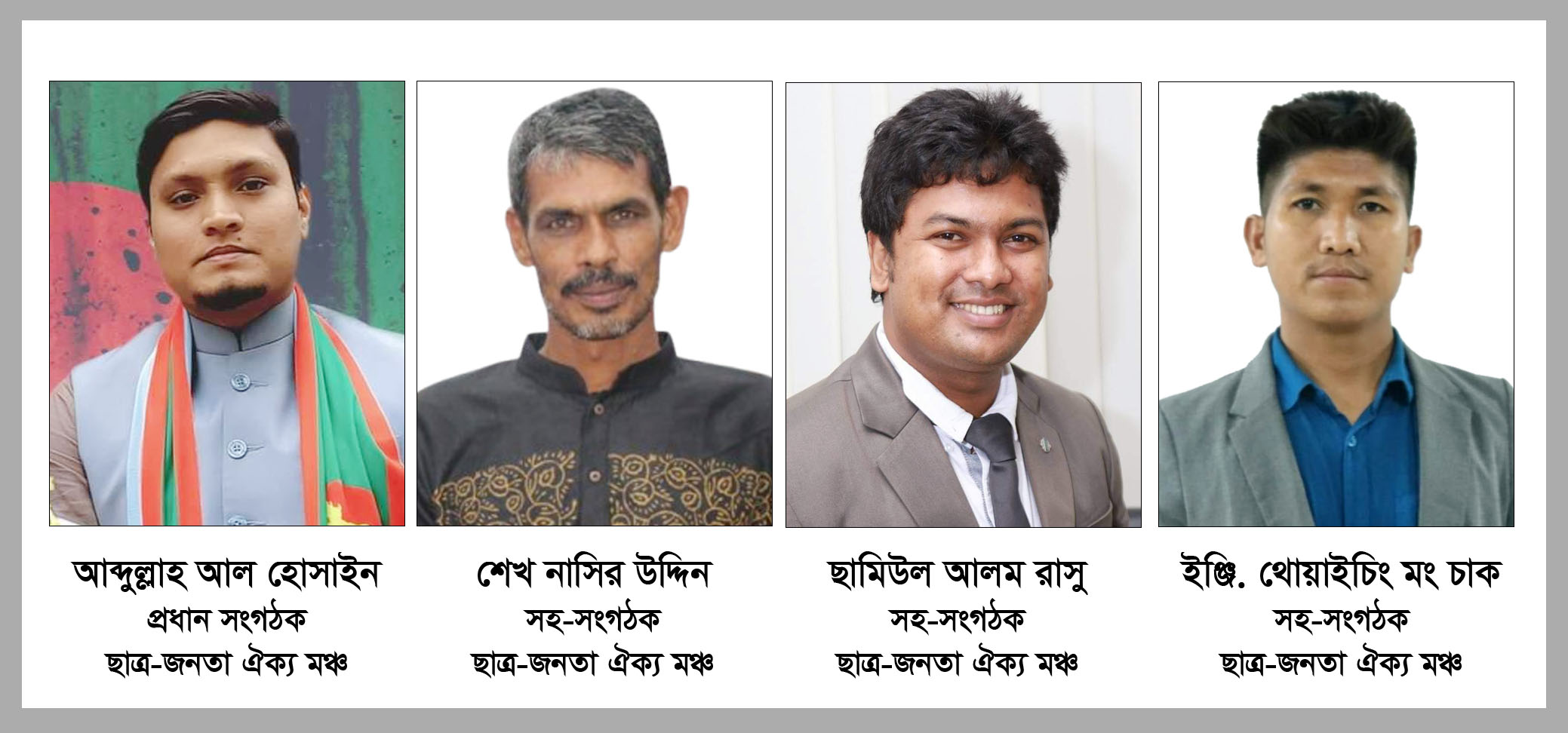 “ছাত্র-জনতা ঐক্য মঞ্চ” প্রধান সংগঠক মনোনীত হয়েছেন আব্দুল্লাহ আল হোসাইন। এছাড়াও সহ-সংগঠক মনোনীত হয়েছেন শেখ নাসির উদ্দিন, ছামিউল আলম রাসু, এডভোকেট সহিদুল আলম, নাজমুল হোসেন মজুমদার, ইঞ্জি. থোয়াইচিং মং চাক, আব্দুল্লাহ আল মাসুম ও ক্বারী আব্দুল আহাদ। খুব শীঘ্রই ১০১ সদস্য বিশিষ্ট কমিটি ঘোষণা করা হবে।