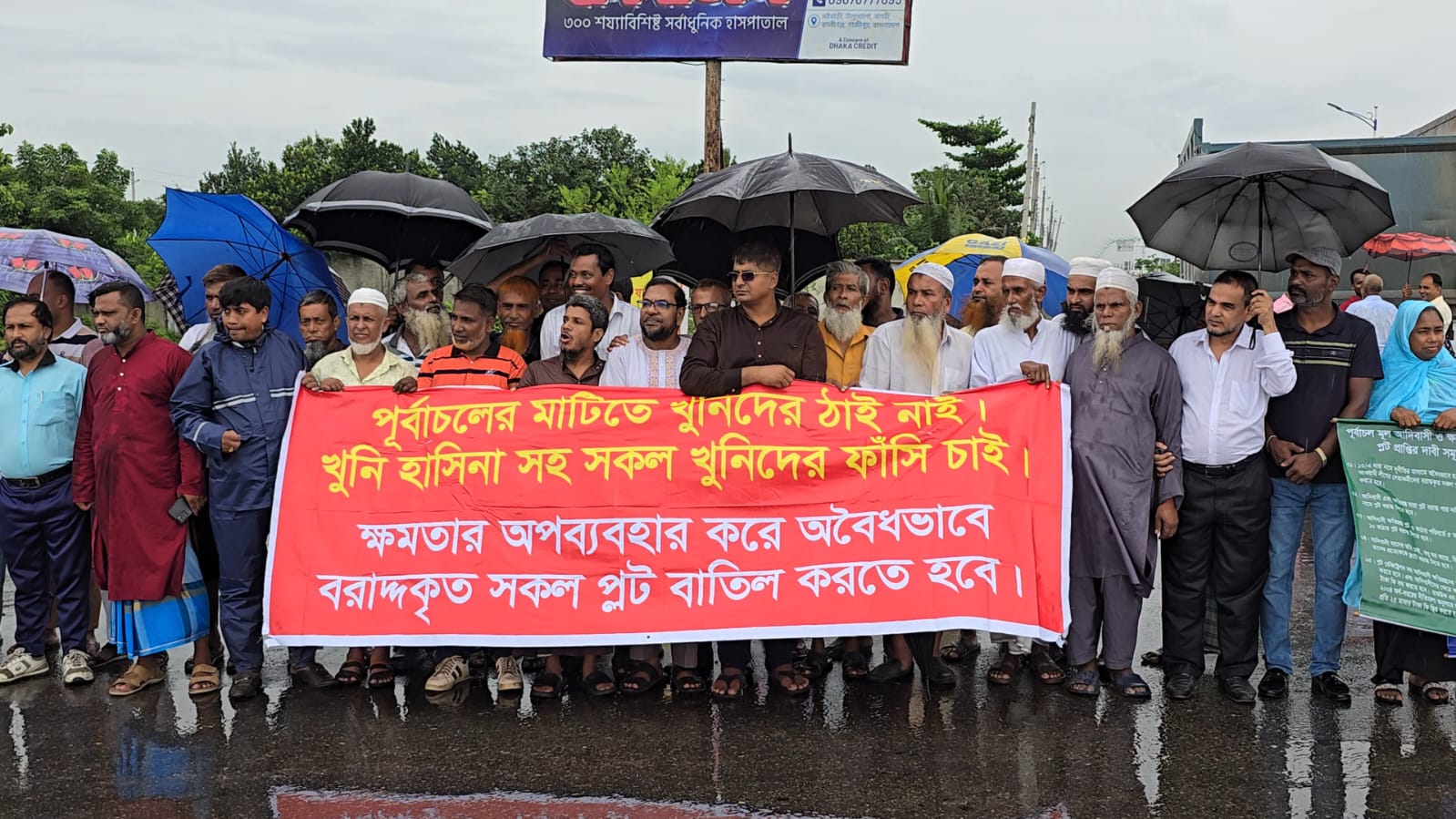 স্টাফ রিপোর্টার: রাজউকের নতুন শহর পূর্বাচলে শেখ হাসিনার পরিবারের ১০ কাঠার ৬টি প্লটসহ অনিয়নের মাধ্যমে বরাদ্দ নেয়া বিগত সরকারের দোসরদের সকল প্লট বরাদ্দ বাতিলের দাবিতে শনিবার পূর্বাচলে বিক্ষোভ ও মানববন্ধন করেছেন স্থানীয় আদিবাসিরা। বৃষ্টি উপেক্ষা করে দুপুর ১২টার দিকে আদিবাসী সমন্নয়ক ও কেন্দ্রীয় যুবদল নেতা দুলাল হোসেনের নেতৃত্বে পূর্বাচলের ১১ নাম্বার সেক্টর পশি এলাকায়