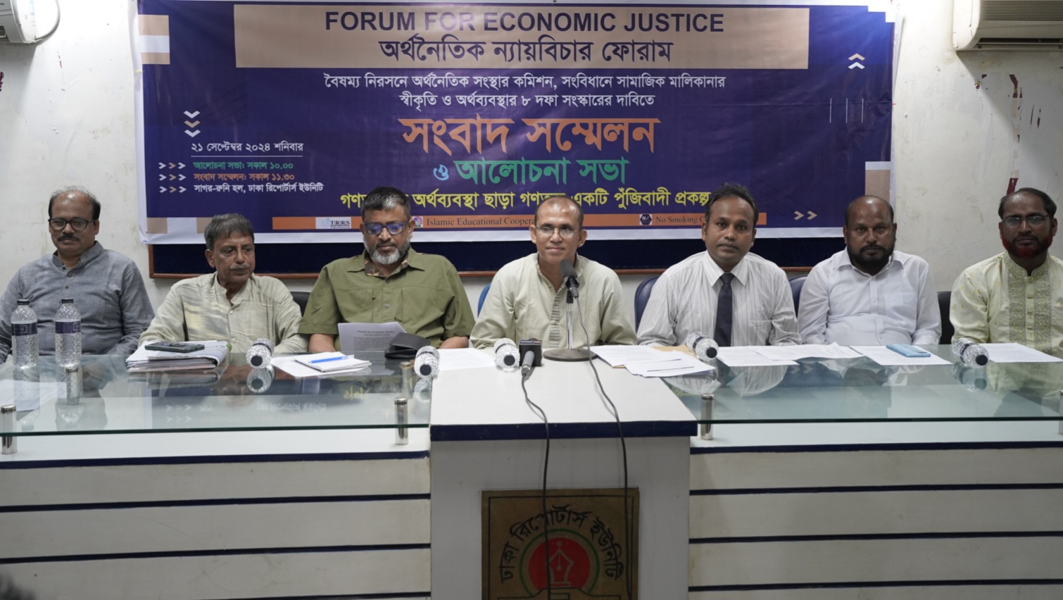 নিজস্ব প্রতিবেদকঃ অর্থনৈতিক বৈষম্য নিরসনে সংস্কার কমিশন গঠন, সংবিধানে সামাজিক মালিকানার স্বীকৃতি ও অর্থব্যবস্থার ৮ দফা সংস্কার প্রস্তাবনা নিয়ে সংবাদ সম্মেলন ও আলোচনা সভা করেছে ফোরাম ফর ইকোনোমিক জাস্টিস (ফিজা)। গতকাল শনিবার সকাল ১১টায় ঢাকা রিপোর্টার্স ইউনিটি’র সাগর-রুনি হলে আয়োজিত এ অনুষ্ঠানে বক্তারা বলেন, শোষণমুক্ত গণতান্ত্রিক রাষ্ট্র বা সমাজ গড়ে তোলার প্রথম এবং প্রধান শর্তই হচ্ছে অর্থব্যবস্থার গণতান্ত্রয়ন।
