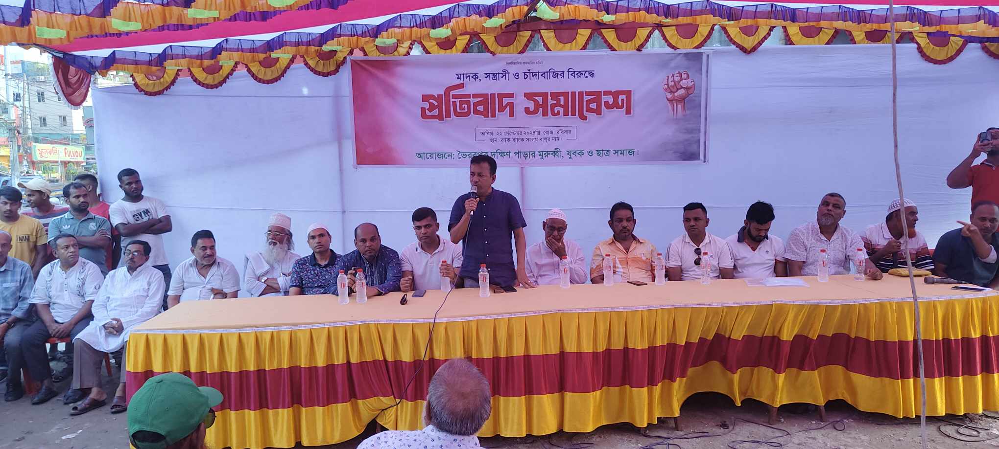 ভৈরব (কিশোরগঞ্জ) প্রতিনিধি: ভৈরবে মাদক সন্ত্রাসী ও চাঁদাবাজির বিরুদ্ধে প্রতিবাদ সমাবেশ অনুষ্ঠিত হয়েছে। আজ ২২ সেপ্টেম্বর রোববার বিকাল ৫টায় শহরের বঙ্গবন্ধু সরণী ২নং ওয়ার্ড দ্বীন ইসলাম ট্রান্সপোর্ট মাঠে এই সভা অনুষ্ঠিত হয়।