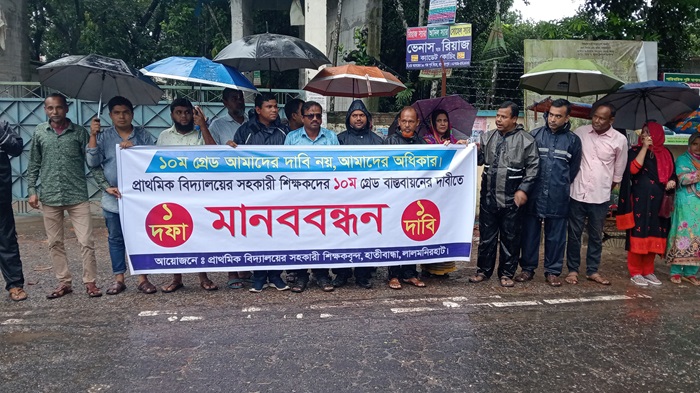 প্রাথমিক বিদ্যালয়ের সহকারী শিক্ষকদের ১০ম গ্রেড বাস্তবায়নের জন্য মানববন্ধন কর্মসূচিতে ২ শতাধিক প্রাথমিক বিদ্যালয়ের সহকারী শিক্ষক অংশগ্রহণ করেন। ঘন্টাব্যাপি এই মানববন্ধনে শিক্ষকরা অবিলম্বে ১০ম গ্রেড বাস্তবায়নের দাবি জানান।