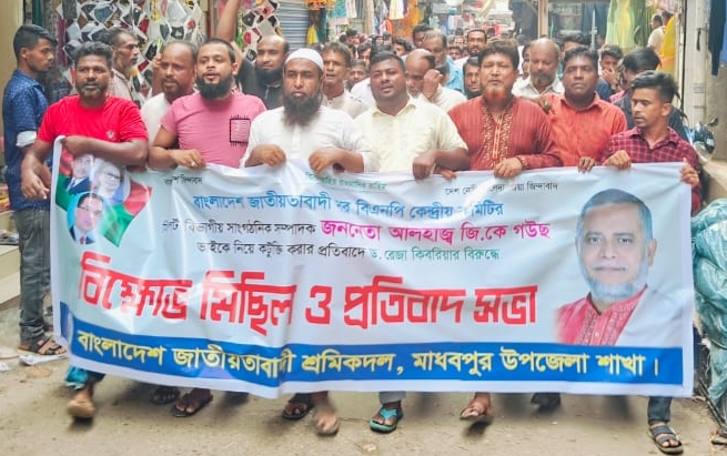 হবিগঞ্জ জেলা প্রতিনিধি: হবিগঞ্জের মাধবপুরে বাংলাদেশ জাতীয়তাবাদী শ্রমিকদল মাধবপুর উপজেলা শাখা'র পক্ষ থেকে বিএনপির জাতীয় নির্বাহী কমিটির সাংগঠনিক সম্পাদক ও হবিগঞ্জ পৌরসভার ৩ বারের পদত্যাগকারি মেয়র আলহাজ্ব জি.ক. গউছ ভাই সম্পর্কে রেজা কিবরিয়ার কটুক্তির প্রতিবাদে বিক্ষোভ মিছিলে প্রতিবাদ সমাবেশ অনুষ্ঠিত হয়েছে।