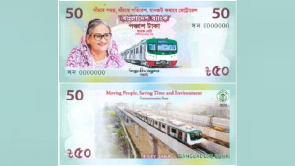 দেশের প্রথম মেট্রোরেলের উদ্বোধন উপলক্ষে ৫০ টাকা মূল্যমানের একটি স্মারক নোট বাজারে ছাড়ছে বাংলাদেশ ব্যাংক। মঙ্গলবার (২৭ ডিসেম্বর) বাংলাদেশ ব্যাংকের ডিপার্টমেন্ট অব কমিউনিকেশন্স অ্যান্ড পাবলিকেশন্স এ তথ্য জানিয়েছে। বুধবার (২৮