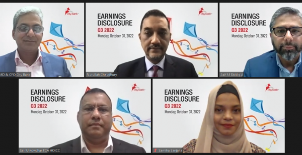 পুঁজিবাজারে তালিকাভুক্ত সিটি ব্যাংক লিমিটেড তাদের ২০২২ সালের তৃতীয় প্রান্তিকের আর্থিক প্রতিবেদন প্রকাশ করেছে। এ উপলক্ষে ৩১ অক্টোবর তারিখে অনলাইনের মাধ্যমে বিনিয়োগকারী, শেয়ার বিশ্লেষক এবং গণমাধ্যমের কাছে ব্যাংকের আর্থিক প্রতিবেদন
