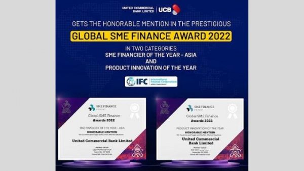 আইএফসি এসএমই ফাইন্যান্স ফোরাম কম্বোডিয়ায় অনুষ্ঠিত গ্লোবাল এসএমই ফাইন্যান্স অ্যাওয়ার্ডস ২০২২-এ দুটি বিভাগে পুরস্কার অর্জন করেছে ইউনাইটেড কমার্শিয়াল ব্যাংক (ইউসিবি)। গ্লোবাল এসএমই ফাইন্যান্স ফোরাম অ্যাওয়ার্ড-২০২২ এ বছরের এসএমই ফাইন্যান্সিয়ার- এশিয়া