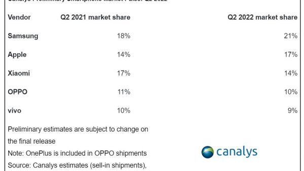 [ঢাকা, আগস্ট ০১, ২০২২] মার্কেট রিসার্চ ফার্ম ক্যানালিস জানিয়েছে এ বছরের দ্বিতীয় প্রান্তিকেস্মার্টফোন শিপমেন্টে পৃথিবীর সবচেয়ে বড় স্মার্টফোন ব্র্যান্ড স্যামসাং। স্যামসাং এর গ্যালাক্সিএ সিরিজের ডিভাইসগুলোর রপ্তানির বৃদ্ধির কারণে ব্র্যান্ডটি এই