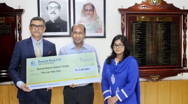 বাংলাদেশ পুলিশের প্রধান গোয়েন্দা সংস্থার বিশেষ শাখা বা এসবি (স্পেশাল ব্রাঞ্চ)-এর কল্যাণ তহবিলে অনুদান দিয়েছে ইস্টার্ণ ব্যাংক লিমিটেড (ইবিএল)। রোববার (৩১ জুলাই) রাজধানীর এসবি প্রধান কার্যালয়ে ইবিএল এ অনুদানের চেক