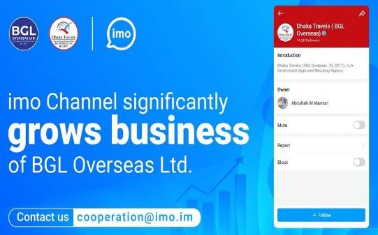 জনপ্রিয় ইনস্ট্যান্ট মেসেজিং অ্যাপ ইমো’র সেবা ও তথ্য বিষয়ক ফ্রি ব্রডকাস্ট প্ল্যাটফর্ম চ্যানেলে যুক্ত হয়ে অভাবনীয় প্রবৃদ্ধি অর্জন করেছে ঢাকা-ভিত্তিক জনপ্রিয় রিক্রুটিং এজেন্সি বিজিএল ওভারসিজ লিমিটেড-বিজিএল ওভারসিজ। বিজিএল ওভারসিজ সরকার