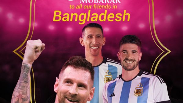এখন কেবল ভালোবাসা ফিরিয়ে দেওয়ার পালা। কাতার বিশ্বকাপে আর্জেন্টিনা ফুটবল দলকে অকুণ্ঠ সমর্থন ও ভালোবাসা দিয়েছিল বাংলাদেশ। বিশ্ব চ্যাম্পিয়নরা তা-ই এখন ফিরিয়ে দিচ্ছে। পবিত্র ঈদুল আজহাতে বাংলাদেশিদের জন্য আলাদা ঈদের