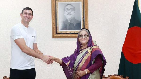বাংলাদেশ সফরে এসে প্রধানমন্ত্রী শেখ হাসিনার সঙ্গে সৌজন্য সাক্ষাৎ করেছেন আর্জেন্টিনার বিশ্বজয়ী গোলরক্ষক এমি মার্তিনেজ। সোমবার (৩ জুলাই) বেলা দুইটায় তিনি প্রধানমন্ত্রীর সঙ্গে সৌজন্য সাক্ষাৎ করেন। ১১ ঘণ্টার সফরে সোমবার
