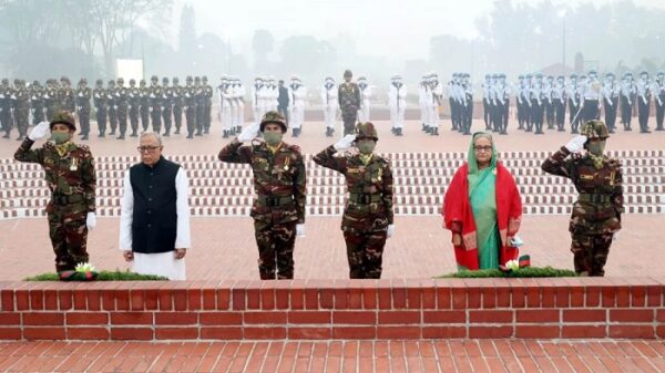 ৫২তম বিজয় দিবস উপলক্ষে সকালে সাভারে জাতীয় স্মৃতিসৌধে পুষ্পস্তবক অর্পণের মাধ্যমে মুক্তিযুদ্ধের বীর শহীদদের প্রতি শ্রদ্ধা নিবেদন করেছেন প্রধানমন্ত্রী শেখ হাসিনা। পুষ্পস্তবক অর্পণের পর তিনি ১৯৭১ সালের মহান মুক্তিযুদ্ধের বীর