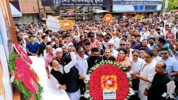 বরিশাল এস এল টি তুহিন: ৭৩তম প্রতিষ্ঠাবার্ষিকী উপলক্ষে জাতীর জনক বঙ্গবন্ধু শেখ মুজিবুর রহমানের প্রতিকৃতিতে ফুলের শ্রদ্ধা নিবেদন করেছে আওয়ামী লীগসহ বিভিন্ন সহযোগী সংগঠন। এ উপলক্ষে বৃহস্পতিবার সকাল ১০টায় নগরীর