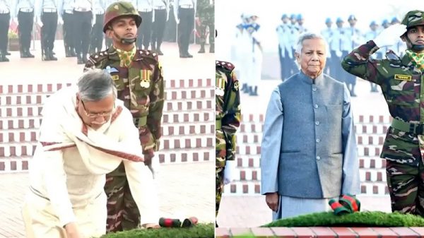 সাভারের জাতীয় স্মৃতিসৌধে মহান বিজয় দিবসে বীর শহীদদের প্রতি শ্রদ্ধা নিবেদন করেছেন রাষ্ট্রপতি মো. সাহাবুদ্দিন ও অন্তর্বর্তী সরকারের প্রধান উপদেষ্টা ড. মুহাম্মদ ইউনূস। সোমবার (১৬ ডিসেম্বর) সকাল সাড়ে ৬টার দিকে