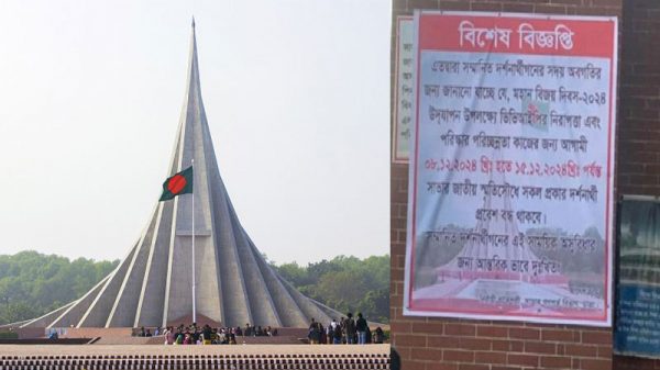 মহান বিজয় দিবস উদযাপন উপলক্ষে সাভারের জাতীয় স্মৃতিসৌধ পরিষ্কার-পরিচ্ছন্নতা ও নিরাপত্তার স্বার্থে জনসাধারণের প্রবেশে নিষেধাজ্ঞা আরোপ করেছে কর্তৃপক্ষ। অর্থাৎ ৮ দিন বন্ধ থাকবে জাতীয় স্মৃতিসৌধ। রবিবার (৮ ডিসেম্বর) সকালে সাভারের