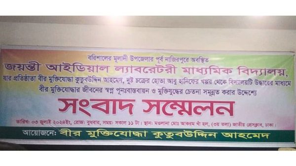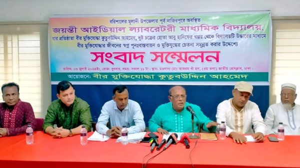 নিজস্ব প্রতিবেদকঃ বরিশাল জেলার মূলাদী উপজেলার পূর্ব নাজিরপুর গ্রামে অবস্থিত জয়ন্তী আইডিয়াল ল্যাবঃ মাধ্যমিক বিদ্যালয়ের ঐতিহ্য রক্ষায় ৩ জুলাই বুধবার জাতীয় প্রেসক্লাবে সংবাদ সম্মেলন করেন বিদ্যালয়ের প্রতিষ্ঠাতা বীর মুক্তিযোদ্ধা কুতুবউদ্দিন