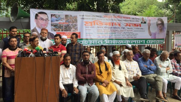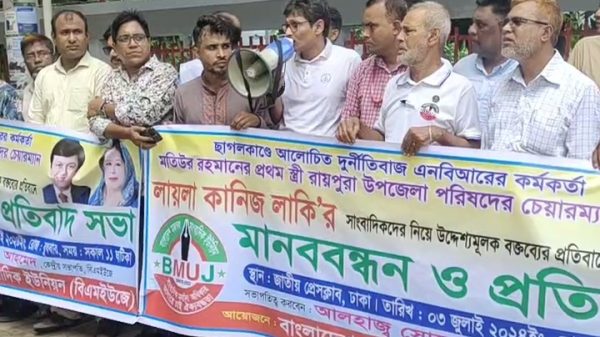 নিজস্ব প্রতিবেদকঃ ছাগলকান্ডে দুর্নীতিবাজ এনবিআর কর্মকর্তা মতিউরের স্ত্রী লায়লা কানিজ লাকি সাংবাদিকদের বিতর্কিত করায় এক হাজার কোটি টাকার মানহানী মামলা করবে বিএমইউজে। বুধবার জাতীয় প্রেসক্লাবের সামনে আয়োজিত প্রতিবাদ সভা ও