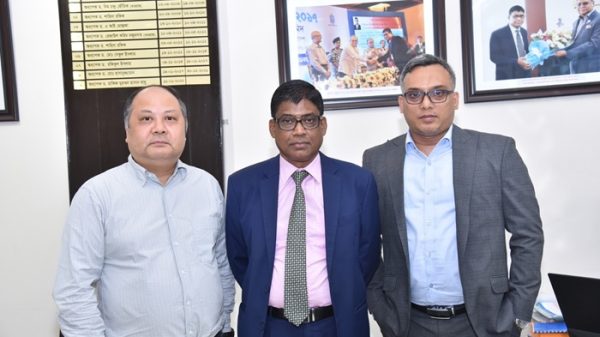 নিজস্ব প্রতিবেদকঃ বাঁ থেকে কিংডম টেকনোলজি এর জয়েন্ট ভেঞ্চার পার্টনার ডিইএক্স বাংলাদেশ-এর চেয়ারম্যান মিঃ ডেভিড ডিং, ডিএসই’র চেয়ারমান অধ্যাপক ড. হাফিজ মুহম্মদ হাসান বাবু এবং ডিইএক্স বাংলাদেশ টেক কোং লিমিটেড