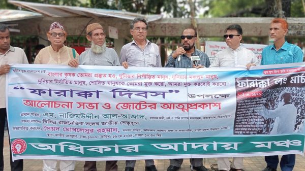 নিজস্ব প্রতিবেদকঃ আজ ১৬ মে ২০২৪ সকাল ১১ টায় জাতীয় প্রেসক্লাবের সামনে অধিকার আদায় মঞ্চের আহ্বানে ফারাক্কা দিবস উপলক্ষে এক সমাবেশ অনুষ্ঠিত হয়। অধিকার আদায় মঞ্চের আহ্বায়ক ও বাংলাদেশ উন্নয়ন পার্টির