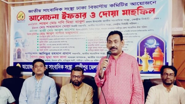 নিজস্ব প্রতিবেদকঃ জাতীয় সাংবাদিক সংস্থার ঢাকা বিভাগীয় কমিটির উদ্যোগে ৮ এপ্রিল ( সোমবার) গাজীপুর শহরের সংস্থার জেলা কার্যালয়ে আয়োজিত আলোচনা, ইফতার ও দোয়া মাহফিলে প্রধান অতিথি হিসেবে বক্তব্য রাখছেন, জাতীয়