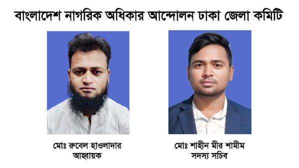কৃষকদল নেতা বিশিষ্ট সমাজসেবক মোঃ রুবেল হাওলাদার কে আহ্বায়ক ও কৃষকদল নেতা বিশিষ্ট সমাজসেবক মোঃ শাহীন মীর শামীম কে সদস্য সচিব করে বাংলাদেশ নাগরিক অধিকার আন্দোলন ঢাকা জেলা শাখার আংশিক
