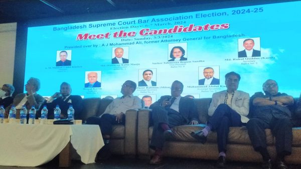 নিজস্ব প্রতিবেদকঃ ৪ঠা মার্চ-২৪,বাংলাদেশ সুপ্রীম কোর্ট বার নির্বাচনের প্যানেল পরিচিতি সভা বার মিলনায়তনে নির্বাচন পরিচালনা কমিশনের আহ্বায়ক মুক্তিযোদ্ধা আবুল খায়েরের সভাপতিত্বে অনুষ্ঠিত হয়। বক্তব্য রাখেন সকল প্রতিদ্বন্ধী প্রার্থীগণ। যাহা অনুষ্ঠিত