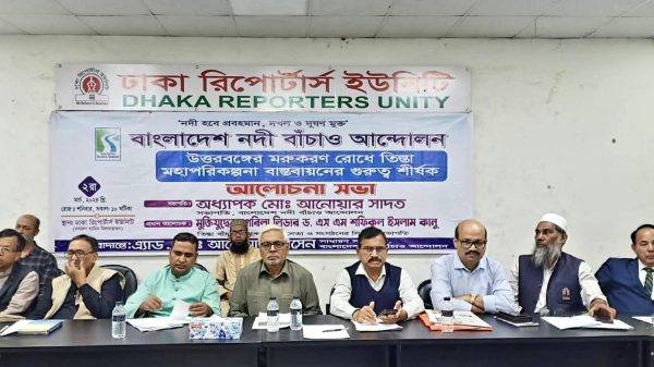 নিজস্ব প্রতিবেদকঃ বাংলাদেশ নদী বাঁচাও আন্দোলনের আলোচনা সভায় আলোচকেরা বলেন, উজানে পানি প্রত্যহারের কারণে বাংলাদেশের তিস্তাসহ সকল নদী নাব্যতা হারাচ্ছে। মৎস ও কৃষিসহ বিভিন্ন সেক্টরও ক্ষতিগ্রস্ত হচ্ছে। ফলে বিপন্ন হচ্ছে জীব-বৈচিত্র,