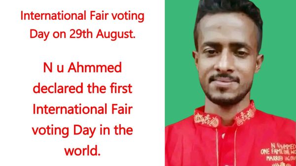 নিজস্ব প্রতিবেদকঃ ২৯ আগষ্ট বিশ্বে প্রথম সকল দেশে সকল জনগণকে International fair voting day পালন আহ্বান জানিয়েছেন গনতন্ত্রের মহানায়ক এন ইউ আহম্মেদ। পালনের নিয়ম কানুন নিম্নরূপ- সকল দেশেই গণতান্ত্রিক নিরপেক্ষ সুষ্ঠু