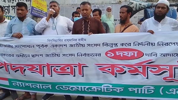নিজস্ব প্রতিবেদকঃ আজ ১৯ জুলাই ২০২৩ সংবিধানে নির্দলীয়, নিরপেক্ষ তত্ত্বাবধায়ক সরকারের বিধান করে বর্তমান সরকারের পদত্যাগের ১ দফা দাবি আদায়ে মালিবাগ মোড় থেকে বিজয়নগর পানির ট্যাংকি পর্যন্ত ন্যাশনাল ডেমোক্রেটিক পার্টি