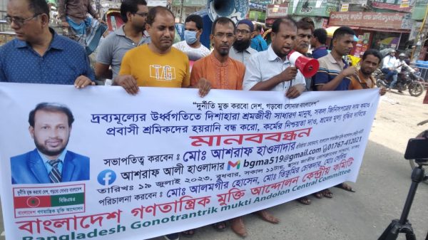 নিজস্ব প্রতিবেদকঃ আজ ১৯ জুলাই ২০২৩ খ্রি. বুধবার সকাল ১১ টায় ঢাকার পল্টন মোড়ে বাংলাদেশ গণতান্ত্রিক মুক্তি আন্দোলন এর উদ্যোগে জিনিসপত্রের দাম কমানো ও প্রবাসী শ্রমিকদের হয়রানি বন্ধের দাবিতে বাংলাদেশ গণতান্ত্রিক