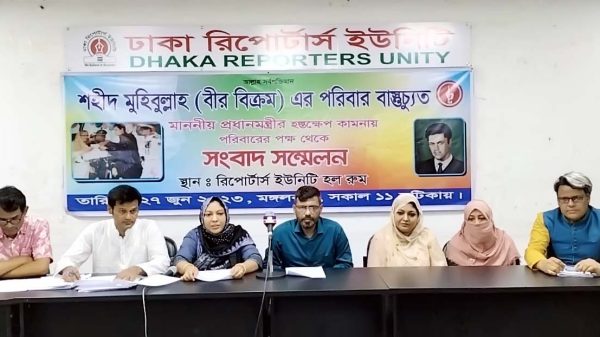 নিজস্ব প্রতিবেদকঃ আজ ২৭ জুন ২০২৩ মঙ্গলবার রিপোর্টার্স ইউনিটি হল রুম সেগুনবাগিচায় জাতির শ্রেষ্ঠ সন্তান মহান স্বাধীনতা সংগ্রামে সম্মুখ যুদ্ধে শহীদ মহিবুল্লাহ বীরবিক্রম পরিবারকে বাস্তুচ্যুত করার প্রতিবাদে উচ্ছেদকৃত বাড়ি ফেরৎ