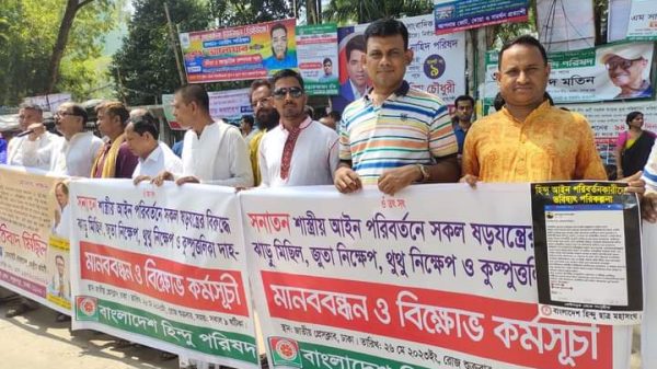 নিজস্ব প্রতিবেদকঃ অদ্য ২৬ মে ২০২৩ খ্রিঃ তারিখ শুক্রবার সকাল ১০.০০ ঘটিকায় বাংলাদেশ হিন্দু পরিষদের আয়োজনে ঢাকাস্থ প্রেস ক্লাব চত্ত্বরে সনাতন শাস্ত্রীয় আইন পরিবর্তনে ষড়যন্ত্রের বিরুদ্ধে ঝাড়– মিছিল, জুতা নিক্ষেপ,