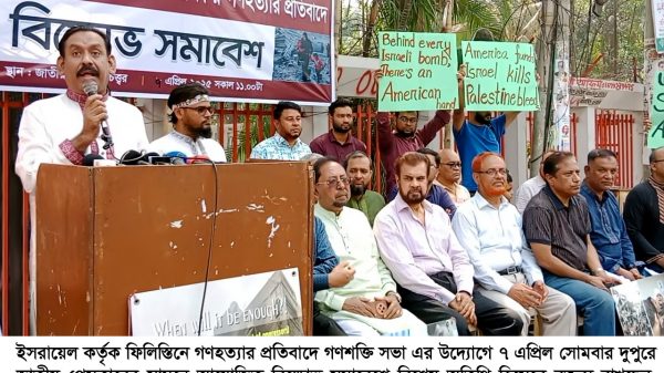 নিজস্ব প্রতিবেদকঃ ইসরায়েল কর্তৃক ফিলিস্তিনে গণহত্যার প্রতিবাদে গণশক্তি সভা এর উদ্যোগে ৭ এপ্রিল সোমবার দুপুরে জাতীয় প্রেসক্লাবের সামনে আয়োজিত বিক্ষোভ সমাবেশে বিশেষ অতিথি হিসেবে বক্তব্য রাখছেন, নিরাপদ সড়ক চাই (নিসচা)
