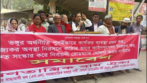 নিজস্ব প্রতিবেদকঃ গণতান্ত্রিক বাম ঐক্যের উদ্যোগে ২৮ জানুয়ারি ২০২৫ মঙ্গলবার, সকাল ১০:৩০ মিনিটে জাতীয় প্রেসক্লাবের সামনে “ভঙ্গুর অর্থনীতি পুনরুদ্ধারে কার্যকর ব্যবস্থা গ্রহণ, নৈরাজ্যকর অবস্থা নিরসনে কঠোর ভাবে আইনশৃংখলা নিয়ন্ত্রণ, দ্রুত
