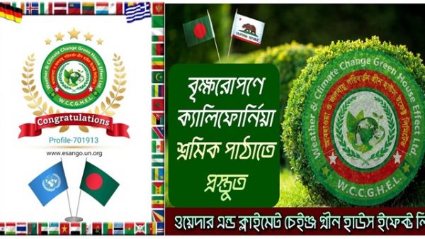 নিজস্ব প্রতিবেদক: পরিবেশ ও জলবায়ু বিষয়ক আন্তর্জাতিক সংস্থা ওয়েদার এন্ড ক্লাইমেট চেইঞ্জ গ্রীন হাউস ইফেক্ট লিঃ ক্যালিফোর্নিয়া সরকারের আহবানে বাংলাদেশ থেকে ৩০০ বৃক্ষ রোপন শ্রমিক পাঠানোর সিদ্ধান্ত ও প্রকল্প হাতে নিয়েছে।