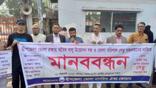 নিজস্ব প্রতিবেদকঃ অদ্য ০১ ফেব্রুয়ারি শনিবার সকাল ১১ টায় জাতীয় প্রেসক্লাবের সামনে দ্বীপজেলা ভোলা নাগরিক ঐক্য ফোরামের উদ্যোগে সংগঠনের আহ্বায়ক জনাব নুর মোর্শেদ এর সভাপতিত্বে ও সদস্য সচিব মোঃ মোস্তফার