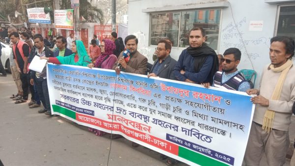 নিজস্ব প্রতিবেদকঃ আজ (২৫ জানুয়ারি) রাজধানীর জাতীয় প্রেসক্লাবের সামনে আমরা ঈশ্বরগঞ্জবাসী- ঢাকার উদ্যোগে ময়মনসিংহ জেলার ঈশ্বরগঞ্জ থানার ভারপ্রাপ্ত কর্মকর্তা উবায়দুর রহমান ও আঠারোবাড়ী তদন্তকেন্দ্রের ইনচার্জ গোলাম কিবরিয়াকে ২৪ ঘন্টার মধ্যে